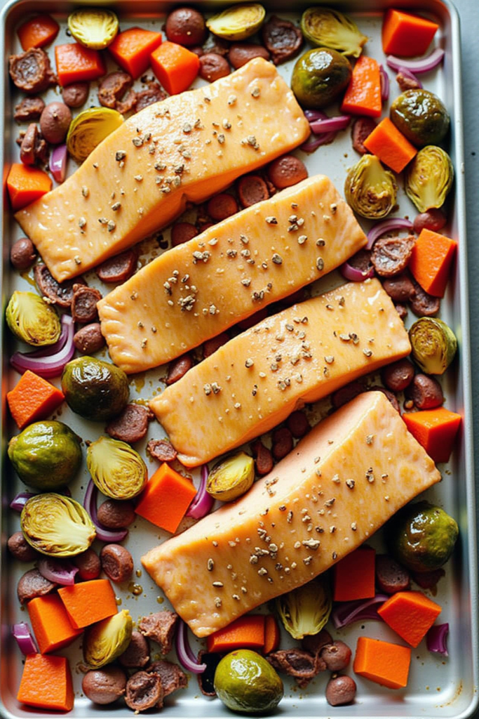 This sheet pan meal yields 4 generous servings. Each serving has approximately 380–450 calories, rich in protein and healthy fats, depending on your veggie combo. The flavorful glaze means you need minimal oil, making this a lighter option that still satisfies.