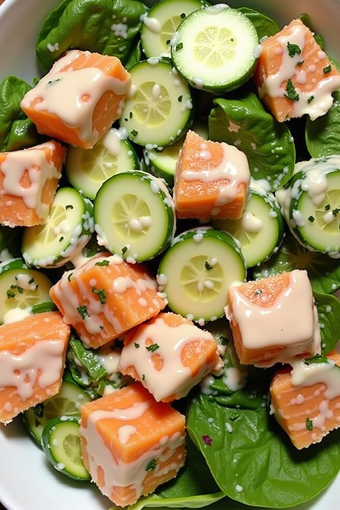 Assemble the salad just before serving to keep the ingredients fresh and crisp. Drizzle with this easy homemade lemon-dill dressing: whisk together olive oil, lemon juice, Dijon mustard, chopped fresh dill, and a pinch of garlic powder. Toss everything gently, so the salmon stays in hearty chunks while the veggies are coated evenly.