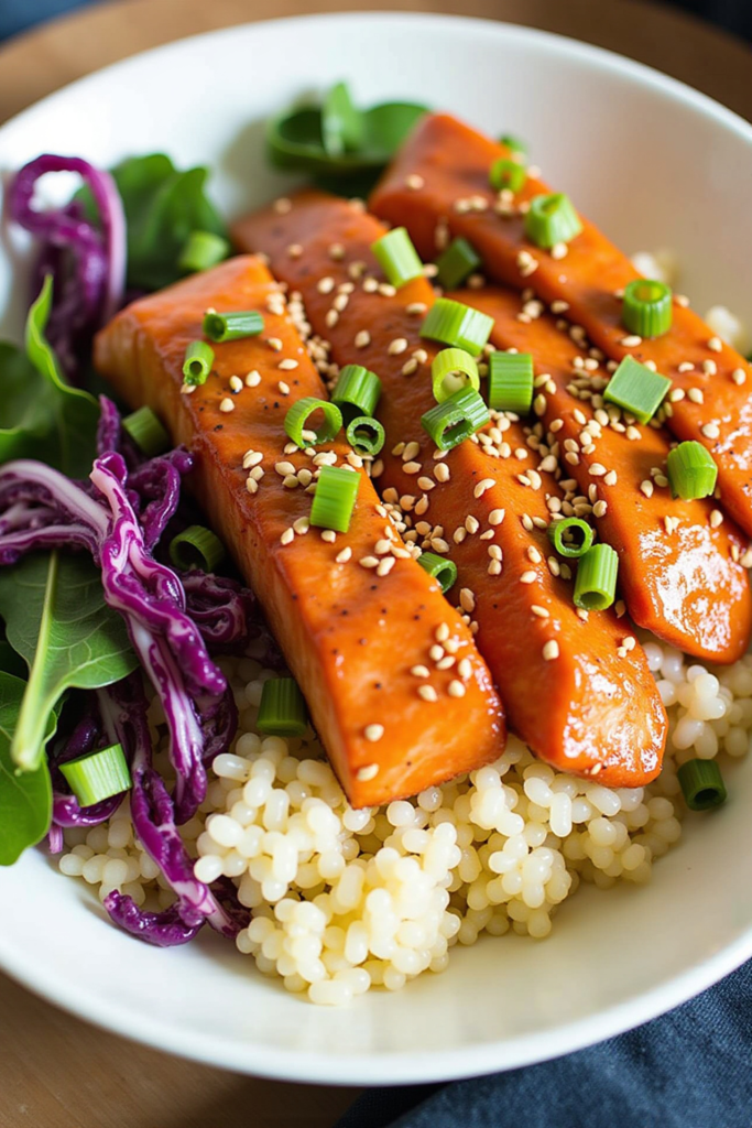 Start with fresh salmon fillets, marinated in a blend of soy sauce, sesame oil, garlic, ginger, and sriracha. Roast or air fry for faster cooking and more flavor. The bowl is filled out with steamed jasmine or brown rice and a rainbow of crisp vegetables—think shredded carrots, cucumber ribbons, and edamame—all tossed in a light, tangy dressing. Top with sliced scallions, sesame seeds, and (optional) avocado for a well-rounded meal.